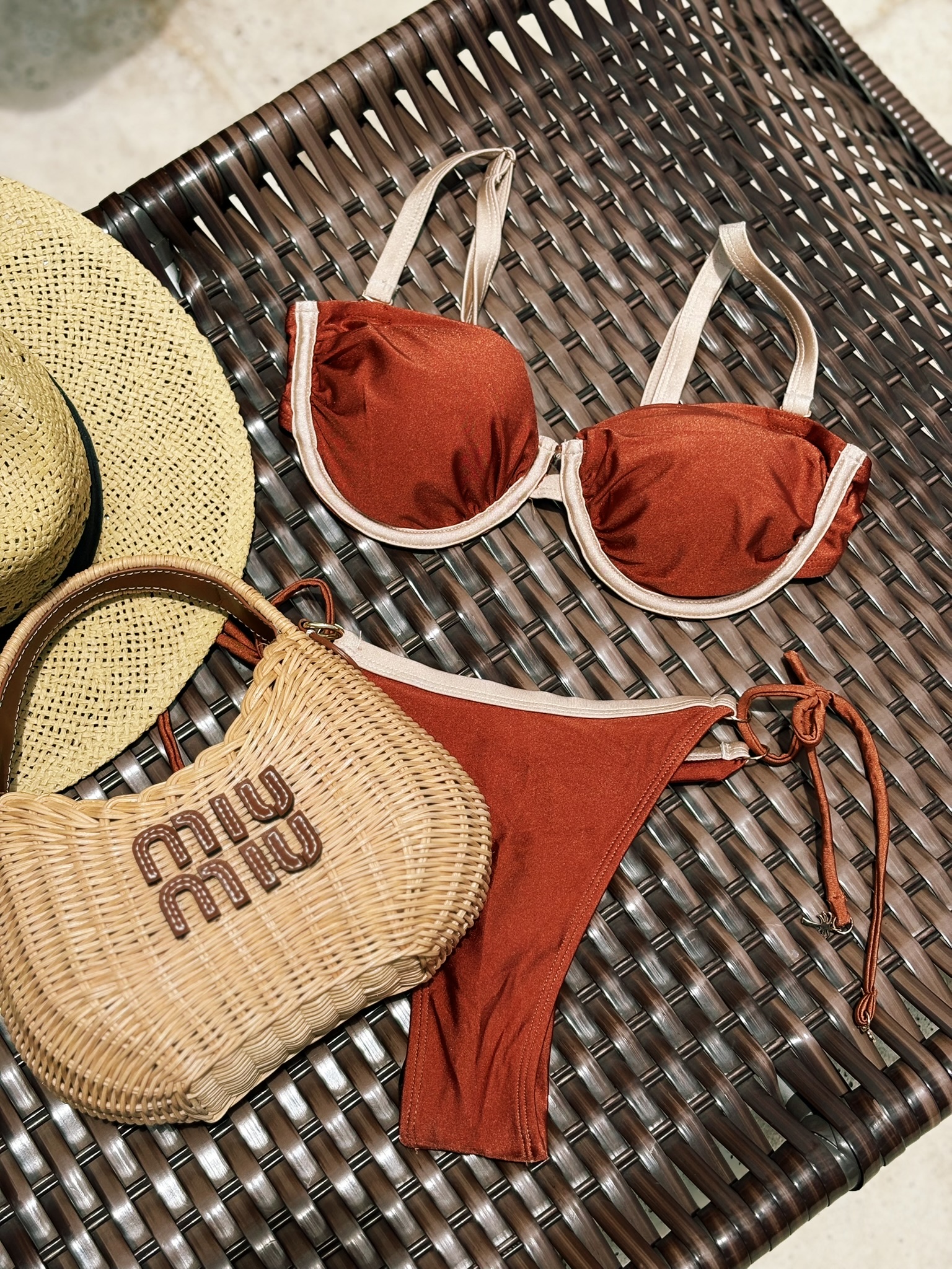 Apresentamos o Biquíni Vitória, um modelo feminino elegante feito em malha macia na cor marrom com acabamento em bege. Este biquíni conta com top estruturado de alças reguláveis para melhor ajuste e suporte, além da calcinha com laterais finas que garantem conforto e estilo à peça. Ideal para quem busca praticidade aliada a um design sofisticado, o tecido possui toque suave e secagem rápida, facilitando o uso em dias de praia ou piscina.